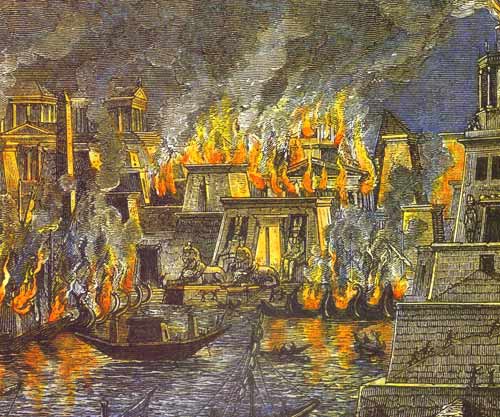 ôte du roi Ptolémée, César se trouve pris au piège dans le palais royal d’Alexandrie par Achillas, général tout-puissant du souverain égyptien, qui déclenche dans la ville une insurrection contre l’empereur romain. César est bel et bien assiégé, et sa situation devient fort délicate. Bien qu’ils soient en nombre très réduit, ses hommes parviennent à mettre le feu aux soixante navires de Ptolémée qui sont à l’ancre dans le port. L’incendie a tôt fait de se propager aux bâtiments alentour et d’atteindre les dépôts de marchandises et les arsenaux. Profitant de la diversion, César se réfugie dans l’île de Pharos, où, en attendant des renforts, il maîtrise l’accès maritime du port.