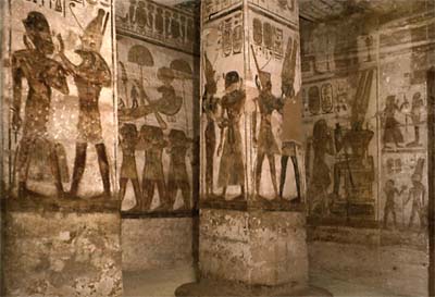 Puis on passe dans la seconde salle à piliers livrant accès à un vestibule autorisant le passage vers une chapelle axiale et deux chapelles latérales. Celle de l’axe abrite les effigies de plusieurs dieux assis sur une banquette et parmi lesquels figure Ramsès II. Il s’agit de Ptah, Amon-Rê, Rê-Horakhty, le roi occupant la troisième place parmi les grands dieux d’état. Ce temple fait bien état du désir de Ramsès II d’avoir voulu être divinisé de son vivant, ce dernier ayant fait regraver certaines scènes pour insérer son image au sein des dieux.