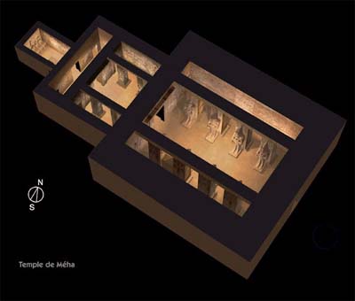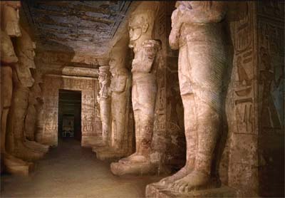 Découvert par J.-L. Burckhardt en 1813, le temple fut ouvert, quatre années plus tard, par G. Belzoni. Franchie l’entrée, s’offre la salle à huit piliers auxquels s’adossent ses statues osiriaques aux traits du souverain, coiffés, au sud et au nord, des couronnes de Haute et de Basse-Égypte. Celle-ci abrite, sur la paroi nord, le plus bel exemplaire connu de la bataille de Qadesh. Sur cette grande salle débouchent deux séries de magasins formant quatre pièces au nord et deux pièces au sud.