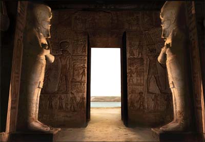 Abou Simbel est connu pour les deux spéos percés sous le règne de Ramsès II. Les temples sud et nord sont respectivement dédiés à Rê et à Hathor, deux personnages divins que transposent, sur terre, Ramsès II et la grande Épouse royale Néfertari. Placés sur le parcours de la crue, ces deux spéos présentent un caractère divinisant pour les souverains dont les silhouettes ornent les parois, car ils jouent les rôles de Rê et de la déesse lointaine, image léonine de la crue. Dieux protecteurs de l’Égypte, ils assurent, par leur participation mythologique, la prospérité à l’Égypte essentiellement liée à ce phénomène cyclique annuel.