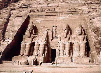 D’une certaine manière, quoique excavés dans la falaise, ces deux temples ne diffèrent pas de temples jubilaires. L’entrée du grand temple, avec ses quatre colosses, dont l’un est détruit, revêt l’apparence d’un pylône. Au pied des jambes de ces colosses, couverts d’inscriptions grecques des soldats de Psammétique II lancées dans une expédition contre Kouch, s’inscrivent les silhouettes de divers personnages de la famille royale : Mouttouy, mère de Ramsès II et Épouse de Séthi Ier, la grande épouse royale Nefertari et le prince Amenherkhopchef.