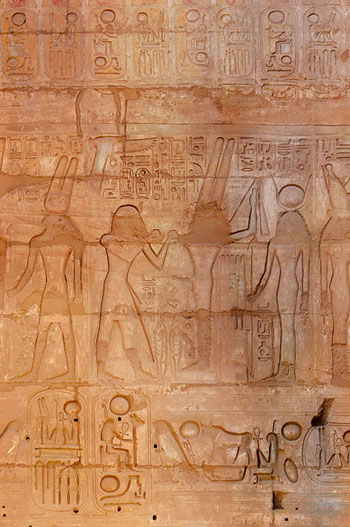 Détail d’un morceau de décor présenté à plat. L’ensemble des décors des colonnes constitue une sorte d’abrégé des scènes gravées sur les murs de la salle et représente différentes phases du culte divin (scènes d’offrandes…). Chaque scène comporte une ou plusieurs divinités comme Amon-Rê, patron de la royauté égyptienne.