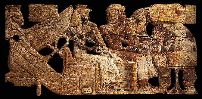 Fragment de naos ou de chaise à porteur ajouré montrant le roi Aménophis Ier divinisé et sa mère Ahmès Nefertari sous la protection d’une déesse
