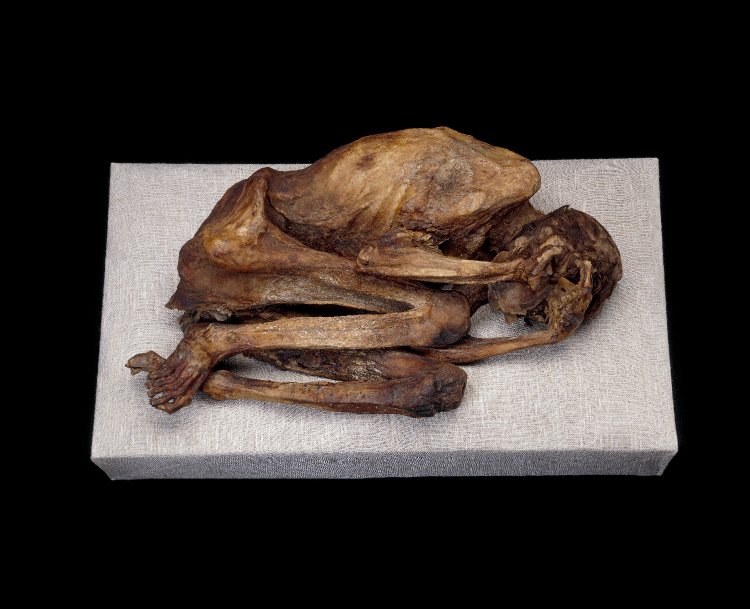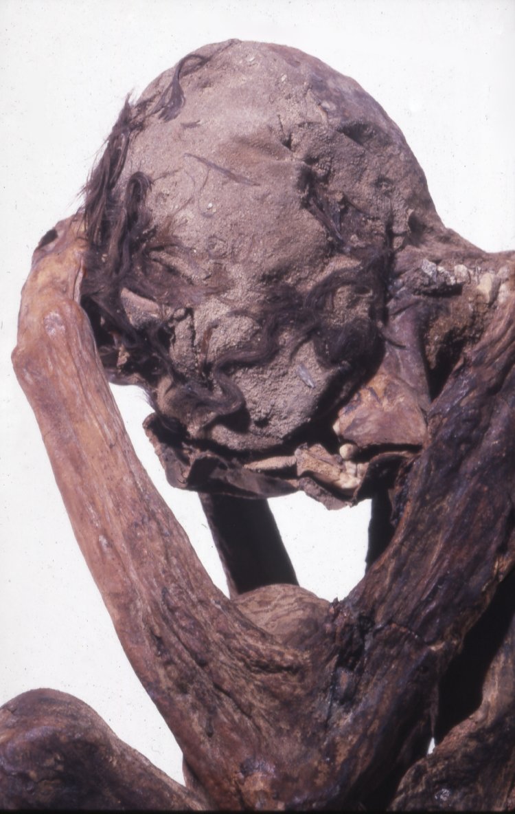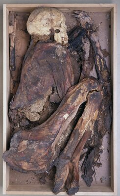 | 32754 | 1,6 m | Adulte assez âgé, sexe incertain | Ce corps de personne âgée a des os décalcifiés, liés à une ostéoporose sénile. Le corps se trouvait probablement dans un panier d’osier, couvert d’une peau d’animal, car des restes d’osier et de fourrure ont été retrouvés, de même que des morceaux de lin, sur le corps. Toutes les dents sont présentes, avec les couronnes usées. De nombreuses côtes sont fracturées, les seuls les os de la main gauche restants sont ceux du poignet. Les jambes sont détachées à cause de fractures à mi-longueur des deux fémurs. Il y a des lignes d’arrêt de croissance sur les tibia et les derniers os des phalanges des pieds sont pour la plupart manquants. |