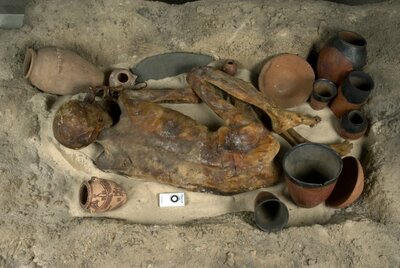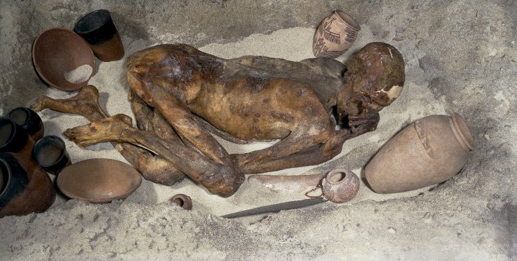 Les seules marchandises qui ont été retrouvés sont un pot avec le corps adulte de sexe féminin et des restes partiels d’osier, de fourrure et le linge avec les autres organes. Dans la période prédynastique, les corps étaient généralement enterrés nus et parfois vaguement emballé. Dans un tel enterrement, quand le corps est couvert de sable chaud, les conditions environnementales font que la plupart de l’eau contenue dans le corps est rapidement évaporée ou évacuée, ce qui signifie que le cadavre est naturellement séché et conservé. Cette méthode a été largement utilisés dans la période pré-dynastique égyptien, avant que la momification artificielle ne soit développé. La momification naturelle qui s’est produite avec ces inhumations dans le sable sec peut avoir conduit à la croyance d’origine dans une survie après de la mort et soit l’origine de la tradition de laisser de la nourriture et des biens matériels pour une autre vie .