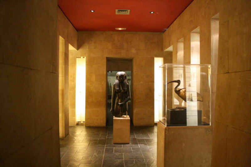 Dans huit piliers formant également vitrine on peut admirer : Nephtys agenouillée en bois polychrome, Isis lactant en schiste, ichneumon (Herpestes Ichneumon, espèce de mangouste se trouvant en Égypte mais également jusqu’en Andalousie ; importée dans les Antilles pour tuer les crotales) en bronze de l’époque ptolémaïque représentée debout coiffé du disque solaire et de l’uræus, une chatte en bronze de la basse époque, mufle de lionne en granit du nouvel empire, stipule en bronze.