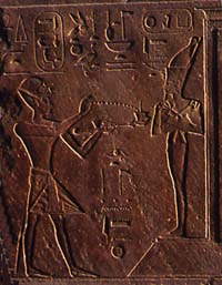 La Reine faisant l’offrande de l’encens à Amon-Rê devant une des ses statues divinisées, ornant un des reposoirs de la barque d’Amon
