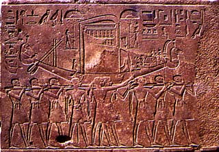La barque sacrée du dieu Amon mené vers le quai embarcadère lors de la "Belle fête de la vallée". Bloc de la chapelle rouge
