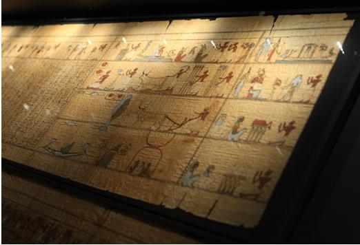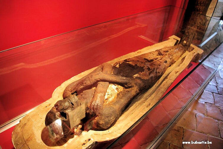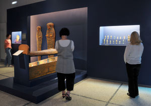 Parmi les reconstructions d’un intérêt particulier, l’on mentionnera une tombe préhistorique avec une momie en position contractée et une fausse porte en faïence (carreaux originaux) provenant des galeries de la pyramide des rois Djoser à Sakkarah. L’on évoquera également un papyrus funéraire long de six mètres et une momie romaine absolument intacte, avec son portrait et son linceul. Des photographies en noir et blanc, ainsi que des peintures, des bustes et des figures en bronze du XIXe siècle sont intégrées dans la partie correspondante de l’exposition, afin de documenter l’époque où les occidentaux ramenaient en Europe les monuments et objets d’art prélevés au Pays du Nil.