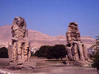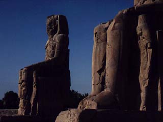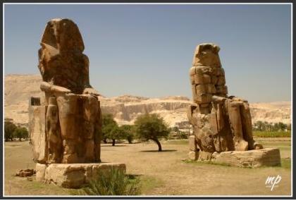 Mais une réparation faite à l’époque de Septime Sévère a éteint cette voix depuis lors. En réalité ces deux statues qui se dressent seules dans la plaine de façon insolite aujourd’hui se trouvaient naguère devant le pylône du grand temple de millions d’années d’Amenophis III, un édifice de dimensions considérables dont la superficie équivalait à celle du grand temple d’Amon-Rê à Karnak. Son implantation en plein dans la Vallée humide est peut être une des causes principales de sa ruine. Ses blocs ont été très tôt dispersés et l’on a retrouvé seulement sur place les fondations de ses murs.