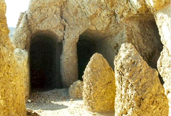 La façade de la tombe a été sculptée directement dans le rocher. La porte centrale, encadrée de chaque côté par quatre fenêtres carrées qui permettent de faire entrer la lumière, ouvre sur une salle transversale d’environ 26 m de longueur et 5,2 m de largeur, avec une rangée centrale de huit colonnes également taillées directement dans la roche.