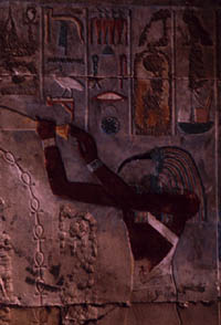 Cet astre diminué sous la forme d’un croissant devient alors une lame redoutable dont Thot se sert pour le châtiment. Ce lien avec le déclin de l’astre et, d’une certaine façon, la responsabilité qui revient à Thot dans celui-ci, lui fait prendre part à légende osirienne, dans le camp de Seth dont il semble parfois, dès les textes les plus anciens, être le frère.