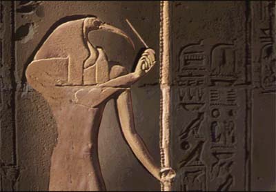 On le voit, Thot semble rattaché à l’ensemble des opérations intellectuelles. Inventeur des paroles divines, les hiéroglyphes, il est le patron des scribes. L’écriture ne serait rien si elle n’était notation de la langue. Thot apparaît ainsi comme l’initiateur de la séparation des langages. L’écriture est son don, tout comme le discours ordonné : il apparaît dans la théologie memphite comme la langue de Ptah elle-même. Il est donc maître du Verbe, et par là même, auxiliaire de la création.