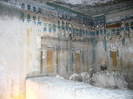 En effet, le tombeau qui a été épargné par les vicissitudes du temps était accessible par le côté nord du monument et comme pour les tombes royales, un long couloir descendant était obstrué par des herses en pierre qui, détail intéressant, étaient munies de tenons en bronze dont le rôle était probablement de bloquer le dispositif une fois la momie de Senousertânkh placée dans le tombeau et la cérémonie funéraire achevée. Ce caveau a livré, outre le sarcophage du grand prêtre et les reliefs habituels destinés à assurer au défunt une vie prospère dans l’au-delà, une version "copiée à lettre" des textes des pyramides gravée sur les parois. Le plafond de la chambre funéraire, toujours en place, est constellé d’étoiles peintes en jaune or sur un fond bleu nuit [7].