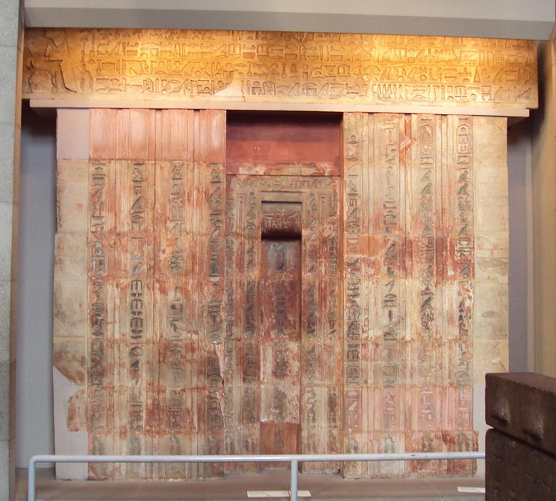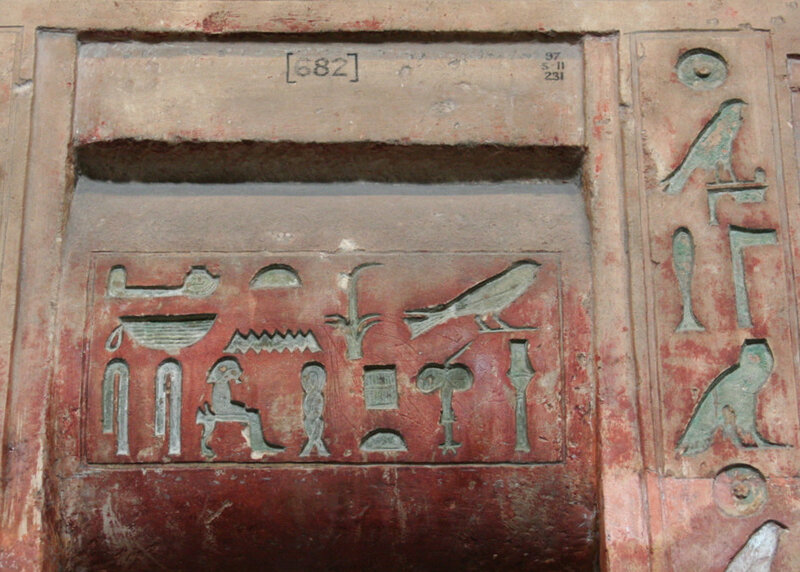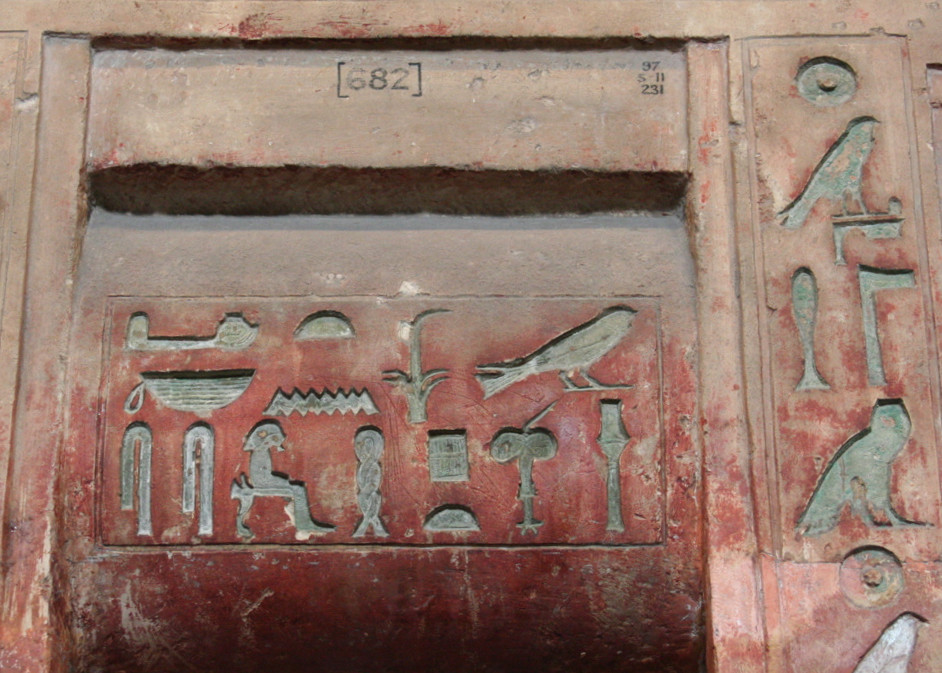 - le linteau de la porte d’entrée du mastaba, exposé au musée du Caire, qui outre les formules laudatives classiques destinées à assurer la survie du défunt, nous indique qu’il épousa la princesse Khâmaât, fille de Chepseskaf pendant le règne duquel il fut promu à la plus haute fonction du clergé memphite ;