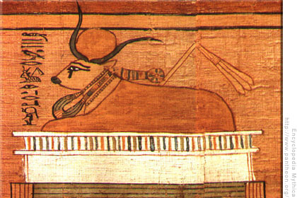 Le culte du dieu égyptien Apis est attesté à une date très ancienne dans la ville de Memphis. Il était représenté sous la forme d’un taureau qui devait être blanc avec des taches noires répondant à des dessins très déterminés. Hérodote a laissé sur Apis ce témoignage : « Quand il fut devenu maître de toute l’Égypte, Psammétique éleva à Héphaïstos des propylées à Memphis, ceux qui sont tournés vers le vent du sud ; et il construisit pour Apis, en face des propylées, une cour où on le nourrit lorsqu’il s’est manifesté, tout entourée de colonnades et couverte de figures : au lieu des colonnes, ce sont des colosses de douze coudées qui en supportent le toit.