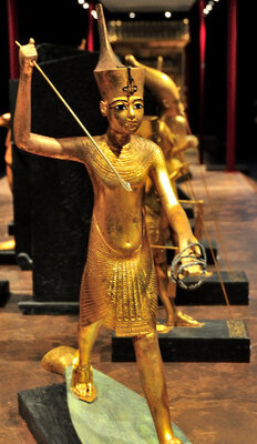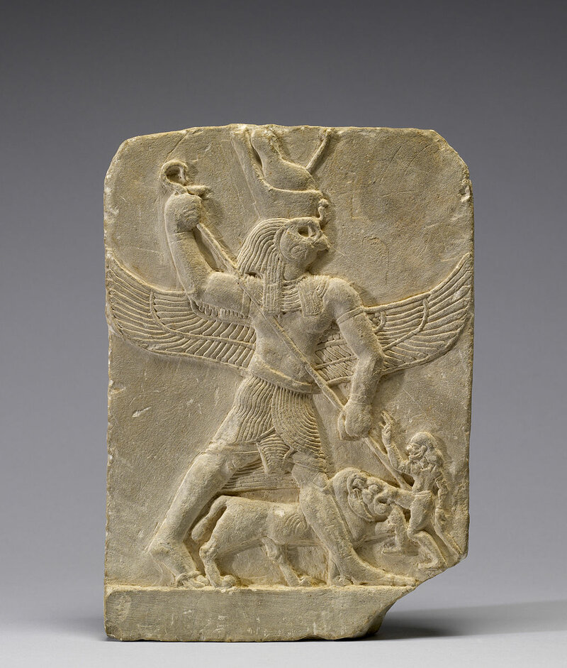 Dans l’imagerie égyptienne, la lutte du bien contre le mal est très anciennement symbolisée par le personnage du Harponneur. Debout dans une barque, un homme transperce vigoureusement de sa lance le corps d’un hippopotame. Dans les tombeaux, le personnage du Harponneur apparaît durant l’Ancien Empire dans les mastabas des proches du pharaon. Le propriétaire de la tombe est montré voguant dans la luxuriance des marais, la lance à la main. Plus tard, durant le Nouvel Empire, dans le trésor funéraire de Toutânkhamon, figure une statuette du roi sous l’apparence du Harponneur. Dans le monde divin, deux divinités sont montrées sous ce rôle : Seth à l’avant de la Barque de Rê luttant contre le serpent Apophis et Horus harponnant l’hippopotame séthien ; à Edfou par exemple (lire plus haut). Durant la période gréco-romaine, dans les temples des oasis du désert Libyque, Seth apparaît sous les traits du faucon horien, accompagné d’un lion — le chevauchant presque — et harponnant un serpent. Le Musée du Louvre conserve un témoin du mélange entre les traditions égyptiennes et romaines. Sur les restes d’une fenêtre sculptée au IVe siècle, Horus est montré sous l’apparence d’un légionnaire à tête de faucon, chevauchant un cheval et harponnant un crocodile118. Il est tentant d’imaginer qu’à l’époque copte, où christianisme et paganisme rivalisaient encore, l’antique mythe du Harponneur égyptien ait influencé la légende et l’iconographie du nouveau saint chrétien.