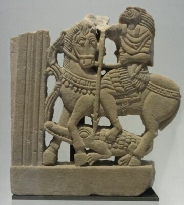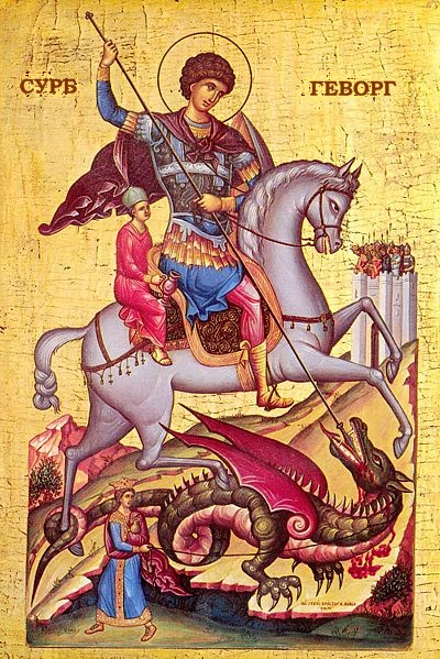 Dans la chrétienté, Georges de Lydda ou saint Georges est l’un des saints les plus populaires qui soient. Sa légende s’est d’abord développée en Orient puis s’est largement diffusée en Occident. De nombreux pays, régions, villes et villages sont placés sous sa bienveillante protection : Géorgie, Éthiopie, Angleterre, Bourgogne, Catalogne, etc. Selon la légende, au IIIe siècle, en Libye, près de la ville de Silène, un monstre terrorisait la population. Chaque jour, des jeunes gens devaient se sacrifier et aller se livrer à lui afin de se faire dévorer. Saint Georges, soldat issu d’une famille chrétienne, rencontra un jour une victime sur le point d’aller à la mort. Monté sur son cheval blanc, le Saint se rendit auprès du monstre et le transperça de sa lance. Ce haut fait est à l’origine de son iconographie la plus commune, un légionnaire en armure, brandissant une lance ou un glaive, assis sur un cheval cabré au-dessus d’un monstrueux dragon.