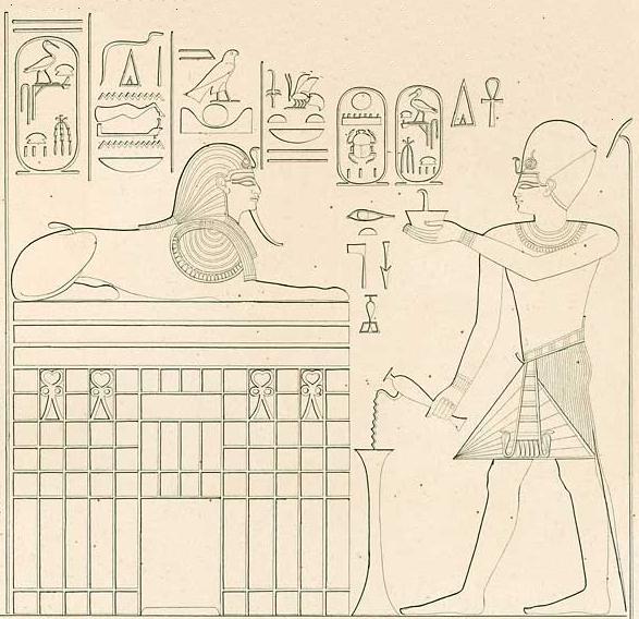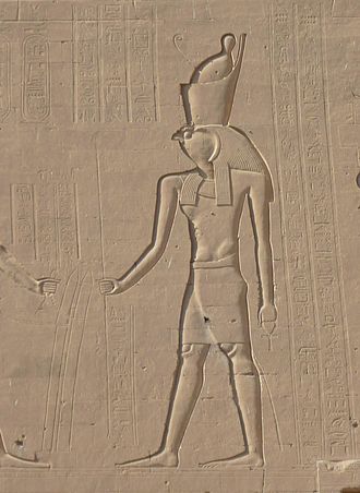En tant que défenseur, Horus apparaît à Létopolis sous les traits de Hor Manou « Horus de Manou ». À l’origine, Manou et Bakhou étaient des toponymes qui servaient à désigner les montagnes du désert occidental. Sous le Nouvel Empire, ces lieux sont devenus des contrées mythiques. En tant que synonyme de Libye, Manou est resté une contrée occidentale mais le terme Bakhou s’est déplacé vers l’orient. Ces deux montagnes ont alors servi à désigner les deux extrémités du parcours est-ouest du soleil104. Dans une scène cultuelle gravée à Edfou, le pharaon offre à Horbehedety le sigle hiéroglyphique de l’Horizon constitué par ces deux montagnes. En échange de cette offrande, le dieu accorde au souverain le trône, le palais royal et un long règne.