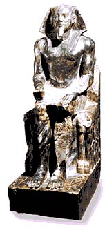 Les statues proviennent des temples funéraires royaux ou des serdab (couloir sans issue réservé aux statues du défunt dans les mastabas). Haute majesté des figures royales de la IVe dynastie : Khephren trônant (Le Caire), dont la tête est enserrée en protection par les ailes éployées du faucon dynastique Horus (alliance de volumes cubiques et harmonie des lignes de la coiffure et des ailes) - ou lion à tête humaine (sphinx), taillé dans un rocher de Gizeh, défenseur de la nécropole, éminent roi-dieu ; puissantes triades de Mykérinôs (Le Caire, Boston) : l’élancement des volumes cylindriques fermés créant une évidente impression de grandeur et de dignité. Portraits privés hautement individualisés : si les corps sont traités assez conventionnellement (toujours suivant la loi de frontalité, qui « divise » verticalement chaque sujet traité en deux parties symétriques et complémentaires), les visages sont sculptés avec un grand souci de réalisme : buste de Ankh-ka-ef (Boston) dont la tête, très modelée, a toute la plasticité de la chair vivante ; tête de femme (Boston), curieusement négroïde et dont la structure, dépouillée, est évoquée par ses lignes essentielles ; statues de Rahotep et Nofret (Le Caire) : opposant savamment les formes anguleuses et puissantes de l’homme, visage viril, nez fort, lèvres épaisses qu’ombre la moustache, à celles enveloppées et rythmées de la femme, qui se succèdent en une harmonie souple et parfaite jusqu’à la tête admirablement belle ; opposition soutenue par les couleurs : rouge foncé du corps de l’homme, jaune et blanc de la femme aux étincelants bijoux rouges, bleus et verts, l’ensemble renforcé par l’éclatante blancheur des trônes.