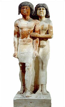 Sous la Ve dynastie, à côté de quelques statues conventionnelles (Ti, Le Caire), apparaît une tendance réaliste, plus humaine, voire intimiste : statue de Ka-aper (l’obèse Cheikh-el-Beled , Le Caire) ; groupes familiaux : l’émouvant couple du Louvre, dont la femme, plus petite, enserre avec une tendre gaucherie, le corps de son mari, dont le visage, à demi souriant, est extraordinaire de vie. Cette tendance s’accomplit sous la VIe dynastie, tant dans la statuaire royale - statue de schiste de Pépi Ier, à genoux, faisant offrande (Brooklyn) ; statues d’albâtre de Pépi II, enfant, sur les genoux de sa mère (Brooklyn), ou, accroupi, un doigt dans la bouche, bras grêles, ventre un peu ballonné de l’enfance (Le Caire) - que dans la statuaire privée : statue de prisonnier libyen, dont l’attitude et le visage tourmenté trahissent toute la tension intérieure et la résignation inquiète (New York).