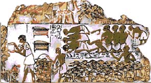Foisonnement des scènes de la vie quotidienne, en bas-reliefs peints, sur les murs des chapelles des mastabas : travaux agricoles (du labourage à la moisson), élevage dans les prairies qui bordaient la vallée (bovins, chèvres, volailles), apport au maître et à sa famille des produits de son domaine ; chasse et pêche sur le Nil - travaux des artisans : potiers, menuisiers, sculpteurs, orfèvres - distractions et divertissements : promenade en chaise à porteurs, concerts et danses. L’Ancien Empire a fixé les grands thèmes des arts graphiques égyptiens et les a traités avec un sens inné de l’observation, une grande sûreté de composition, un humour léger.