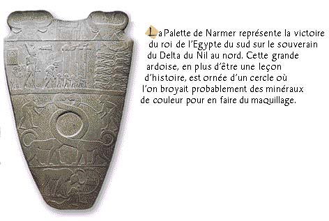 De la fin de la préhistoire nous sont parvenus de petits bas-reliefs, sculptés sur certains objets usuels ou votifs en ivoire (peignes, manches de couteaux : tel celui trouvé au Gebel el-Arak, et actuellement au musée du Louvre) ou en schiste (palettes à fard) : théories d’animaux sauvages ou de guerriers chasseurs, témoins de la vie des tribus alors anarchiquement répandues au long de la vallée. La palette de Narmer (roi unificateur de l’Égypte) est le premier document historique de l’art égyptien proprement dit.