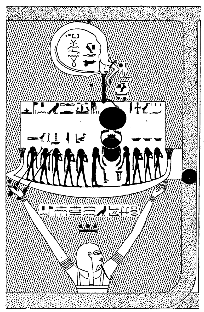 Tel le serpent Ouroboros qui se mord la queue, Osiris est lové sur lui-même. Son corps forme un cercle et la notice dit que : « C’est Osiris qui encercle la Douât ». Cette représentation du dieu est une manière de montrer que le temps est cyclique. Le cercle symbolise la perfection et le mouvement. Ce retour permanent des choses et des événements est une succession de régénérations. Osiris et Nout sont représentés à l’envers pour montrer que la Douât n’est pas soumise aux mêmes règles que l’univers ordonné. Quand le Soleil y entre, il ne peut qu’en ressortir. Le soir, le Soleil entre dans l’Occident. Il se régénère lors de ses passages dans la Douât, qui est le monde de la nuit et de la mort gouverné par Osiris. Puis, il renaît à l’aube lorsqu’il sort de l’horizon oriental. Cette sortie du monde souterrain étant symbolisée par le second soleil qui se situe à la proue de la barque solaire. Nout (le ciel) est située entre la Douât et l’univers ordonné, formant un lien entre les deux mondes. La notice dit que : « C’est Nout qui reçoit Rê. » [6]