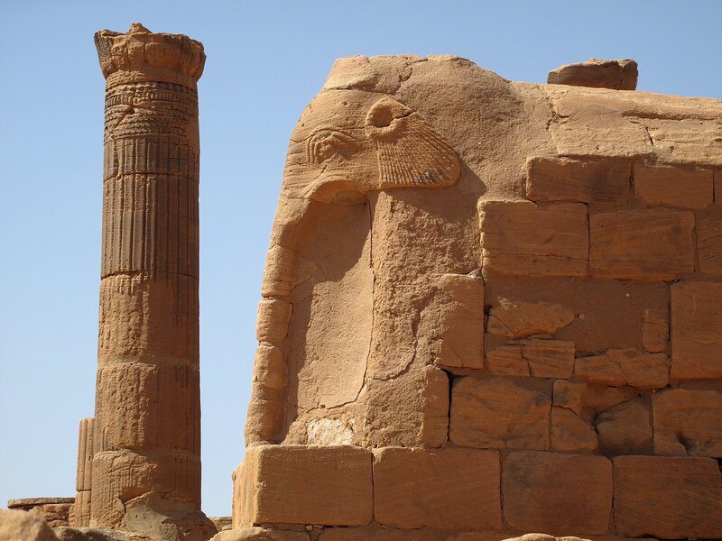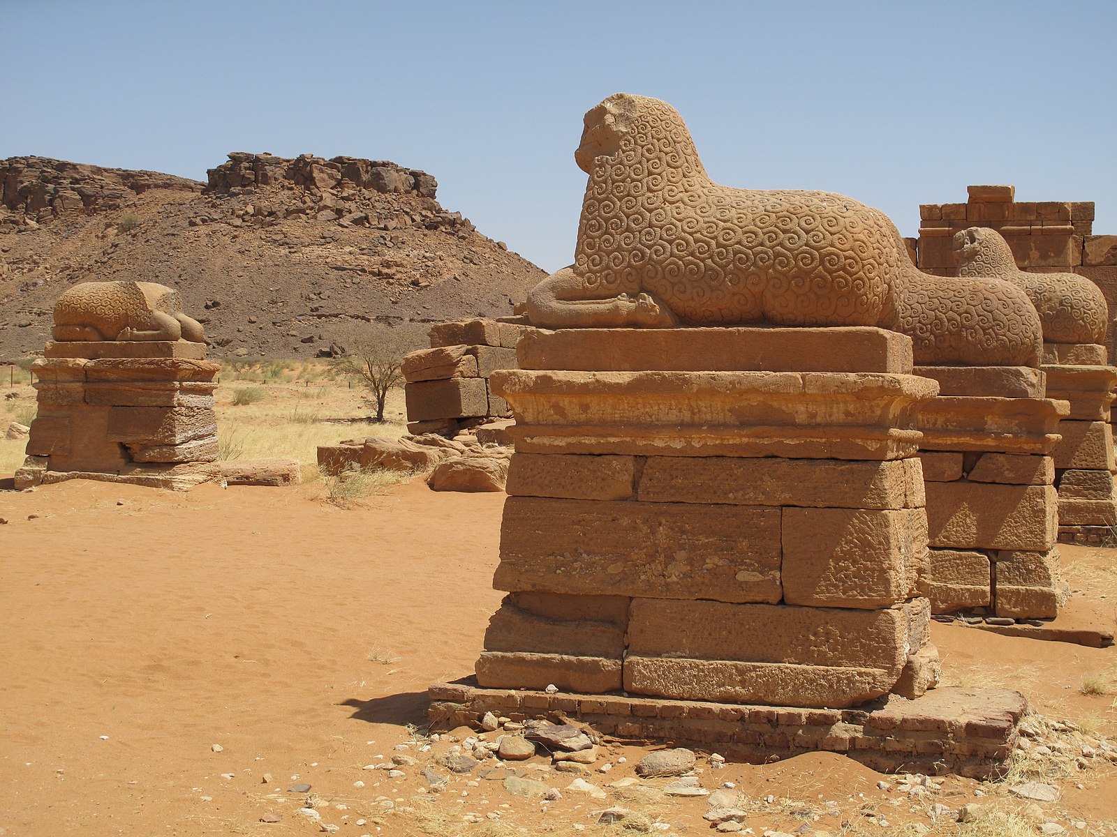 C’est à l’est de la cité que sont situés les principaux monuments et les nécropoles. Le temple d’Amon, dieu dynastique, est construit en brique, entouré d’une enceinte ; son plan ne diffère pas grandement de celui des sanctuaires égyptiens ; son téménos renferme des édifices royaux. Une autre enceinte, accolée à celle du temple, groupe des palais et des thermes. Ce complexe semble remonter au VIe siècle, mais l’occupation majeure se situe du IIe siècle au Ier siècle après J.-C. Des ruines qui s’étendent à environ deux kilomètres à l’est de la ville doivent peut-être s’identifier au temple du Soleil dont parle Hérodote (II, 29) : une rampe conduit à une plate-forme qui supporte le sanctuaire entouré d’un portique à colonnes ; les murs extérieurs de ce podium sont décorés de reliefs représentant des prisonniers, des scènes de victoires et de processions ; l’édifice semble dater du règne d’Aspelta ( VIe siècle), il a été restauré à la fin du Ier siècle. Le temple du lion Apedemak, dieu typiquement méroïtique, fut construit au sommet d’un crassier, également à l’est de la ville ; le seul témoignage chronologique est une base de statue au nom du roi Teqerideamani (246-266). Au nord de l’enceinte royale se trouve le temple dit d’Isis. Dans son état le plus récent, il date de la fin du Ier siècle. D’autres temples de la cité sont bien mal connus ; au nombre des dernières découvertes se comptent plusieurs sanctuaires qui jalonnent une allée d’honneur menant à l’entrée principale du grand temple d’Amon.