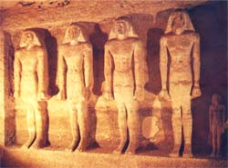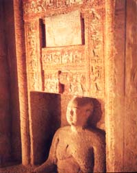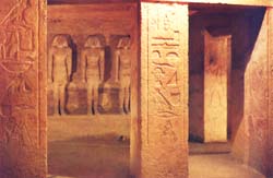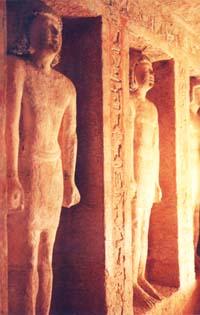 Le mur sud de la chambre à piliers qui précède le lieu des offrandes est orné d’une série de statues en haut relief alignées dans une niche unique, dont le rôle était de veiller sur le défunt.