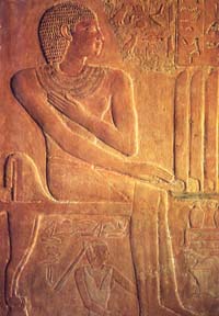 Sous son siège est figurée, à plus petite échelle, son épouse Méréritès. Les colonnes de hiéroglyphes donnent la liste des objets destinés au défunt.