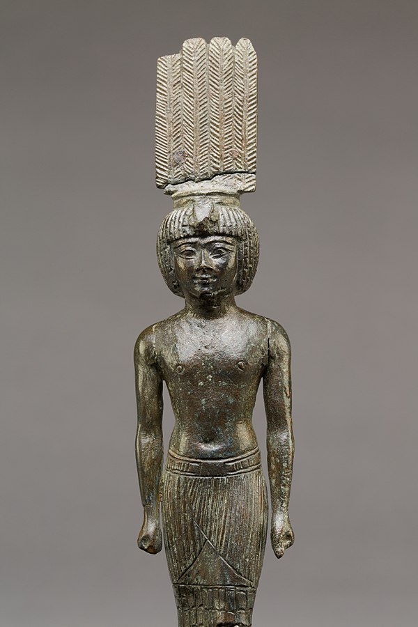 On le représente coiffé de hautes plumes et tirant une corde venu du ciel. Il possédait deux sanctuaires situés à Sébennytos et This.