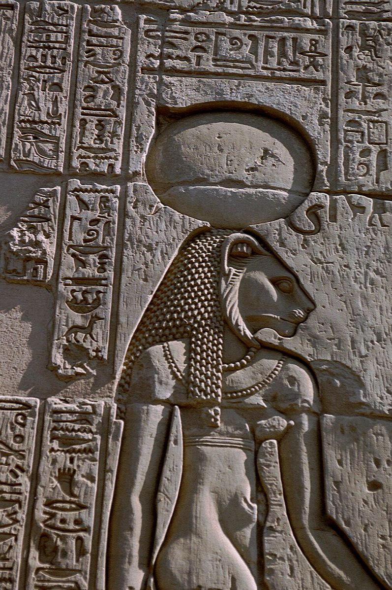 Les textes égyptiens la présentent comme la fille du dieu Soleil, Rê, incarnant l’œil de ce dernier. Déesse guerrière, elle se bat seule ou bien accompagnée de son armée de génies porteurs de flèches et de couteaux.