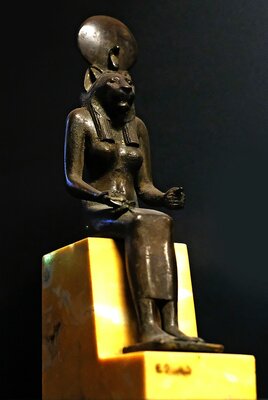 Sekhmet [1] la puissante est une déesse de la mythologie égyptienne. Elle est représentée par une femme à tête de lionne portant d’abord l’uraeus, puis, par la suite, le disque solaire ; de sa bouche de lionne sortent les vents du désert.