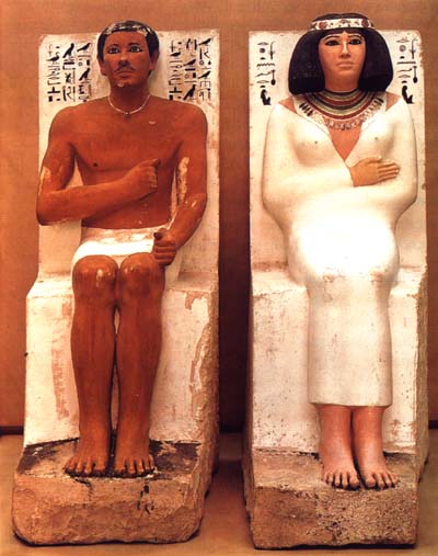 Ces deux grandes statues, de taille identique, furent découvertes dans le mastaba d’un fils de Snéfrou, le prince Rahotep. Elles figurent ce haut dignitaire - il était général, grand prêtre de Rê à Héliopolis, directeur des expéditions et des constructions - en compagnie de son épouse, Nofret. C’est ce que nous apprennent les inscriptions se détachant en noir sur le fond blanc.