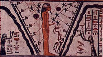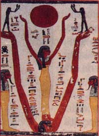 C’est une nouvelle figure de Nout. Dans cette attitude, elle redonne vie au soleil, qu’elle élève depuis les profondeurs du monde souterrain. Sous ses bras, deux divinités obscures figurent. L’Occident à droite et l’Orient à gauche.
