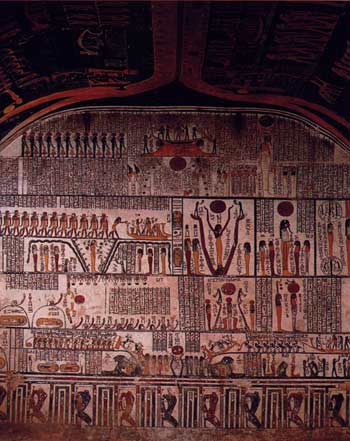 cinquième couloir (7) accompagnés à nouveau de scènes du Livre de la vache du ciel. C’est seulement sur les parois du vestibule (8) que l’on rencontre le Livre des morts. Dans la chambre funéraire (9), où ne subsiste aujourd’hui qu’un sarcophage brisé, les parois sont ornées du Livre de la terre et de celui du jour et de la nuit. L’extraordinaire plafond astronomique représente Nout sous un double aspect de jour et de nuit, reproduisant ainsi le cycle perpétuel de la renaissance du soleil.