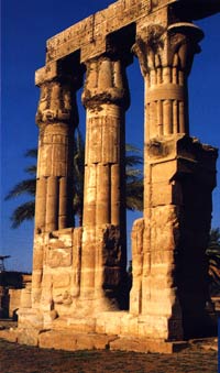 De ces ensembles peu de vestiges sont encore repérables au contraire de la façade du portique de la salle hypostyle élément devenu classique dans l’architecture des temples de l’Égypte tardive.
