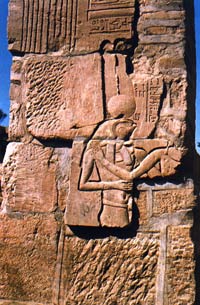 En suivant cette allée processionnelle on parvenait à une grande porte dont la décoration date du règne de Tibère et dont il ne reste que les montants latéraux, le linteau et la gorge qui la couronnaient ayant disparus ou plus probablement étant à rechercher parmi les alignements de blocs déposés et répertoriés à proximité par les chercheurs.