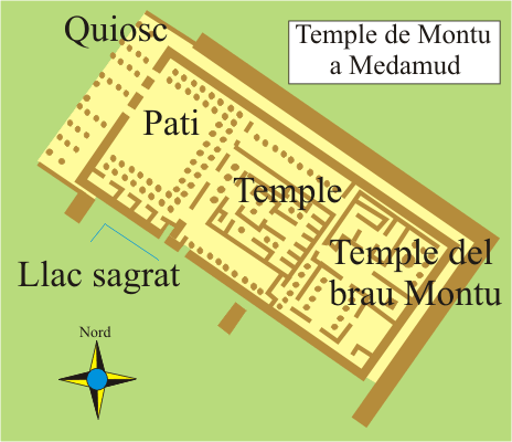 L’enceinte du temple comprenait également un lac sacré et un puits profond, construit avec les éléments du temple du Nouvel Empire et que les habitants du village actuel ont comblé avec les pierres du temple de Montou car il représentait un danger mortel pour les enfants qui ont fait de cet espace archéologique leur terrain de jeu.