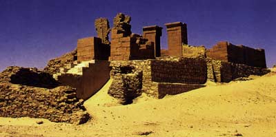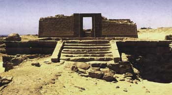 On accédait, par une allée pavée, à la cour péristyle qui donnait sur le sanctuaire proprement dit. Un hall d’entrée donnait sur différentes allées latérales ainsi qu’un escalier qui permettait d’accéder à une terrasse. Le vestibule à offrande se trouvait à l’ouest du temple ; il communiquait avec les magasins du sanctuaire. De cet endroit un deuxième escalier menait lui aussi à la terrasse. Ces deux escaliers jouaient un rôle dans la célébration de certaines fêtes.