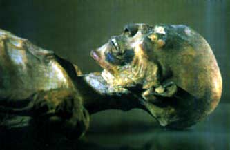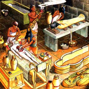 En empêchant la décomposition du corps, les Egyptiens croyaient permettre à l’âme du défunt de rejoindre le monde souterrain pour y commencer une nouvelle vie. Cette idée de conserver une apparence humaine au mort est certainement née de l’observation de cops naturellement momifiés par les sables secs du désert, il y a plus de 3000 ans. Les premiers témoignages connus remontent à la fin de la IIIe dynastie, 2600 ans avant J.C., mais c’est sous la XXIe dynastie, que les techniques de momification atteignent leur apogée. Au début, les cadavres étaient seulement enveloppés de bandelettes enduites de résine, mais à partir de la IVe dynastie, les viscères sont ôtés et enfermés dans des vases canopes posé près du défunt. Le progrès le plus important est la découverte des propriétés du natron (ou natrum), un carbonate sodium provenant du delta du Nil qui à la particularité de déshydraté naturellement les tissus. Les Anciens Egyptiens l’utilisaient par ailleurs comme dentifrice, antiseptique et détergent. Sous la XXIe dynastie, les maîtres embaumeurs améliorent la présentation du défunt en incisant la peau du visage afin d’y glisser de l’argile pour lui redonner du volume.