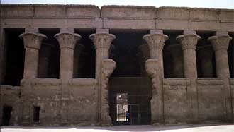 Les textes revêtant les parois du temple d’Esna témoignent d’une richesse théologique sans pareille au plan du contenu religieux. Gravés sur les fûts des colonnes, ils livrent, en effet, le calendrier des fêtes d’Esna, un récit cosmogonique, le grand hymne à Khnoum-Rê. Deux hymnes cryptographiques, gravés aux deux extrémités du pronaos, au nord et au sud, sont écrits à l’aide de deux séries de hiéroglyphes : des crocodiles et des béliers. Ces textes, jusqu’à présent, n’ont pas été déchiffrés. A la lecture des textes compréhensibles, Khnoum-Rê dont le rayonnement assure la richesse agricole est celui qui fait reverdir la campagne, assure la régénération des êtres. Ce rayonnement s’exprime à Esna par la forêt des colonnes qui, chacune, évoque le verdoiement de la campagne. Les chapiteaux floraux composites constituent les plus beaux exemplaires des temples gréco-romains ; leurs fûts, encore délicatement colorés, parviennent à donner une vision d’un de ces temples qui évoquaient l’idée de la nature elle-même.