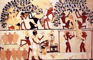Selon le récit de la Vache Céleste, la déesse, semant la mort et la perturbation dans les déserts, est bientôt rejointe par les deux envoyés chargés par Rê de la ramener. Ceux-ci, en préparant une boisson faite de bière colorée d’hématite rouge d’Eléphantine et mêlée d’épices, parviennent à tromper la lionne furieuse qui prend goût à ce breuvage. Sekhmet revient en Egypte, libérant, avec l’ivresse, la crue du Nil. Aussi, à l’annonce de l’inondation, des fêtes étaient célébrées dans le pays tout entier à l’occasion desquelles, au lieu de boire de la bière ou, plus simplement, de l’eau, on consommait force vin, à l’exemple de la déesse redevenue une jeune femme et passant, à Bubastis, pour la déesse du foyer : Bastet. Selon une autre version, Hathor, empruntant un parcours libyque, à travers les voies de migration annuelle, revient dans la Vallée et est alors accueillie avec allégresse. Sans doute le même mythe de la Lointaine était-il adapté à la région de vignobles d’Imaou.