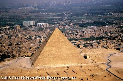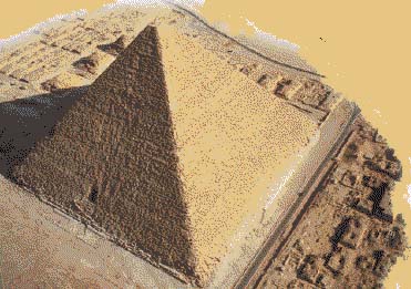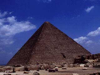 Après Snéfrou, son fils Khéops (ou Khoufou) édifia à Guizeh pour sa tombe la célèbre Grande Pyramide, considérée par les Grecs comme l’une des sept merveilles du monde. Cette pyramide, qui mesurait à la base 440 coudées de côté, soit environ 230 mètres, couvrait à elle seule plus de 5 hectares. Sa hauteur, encore actuellement de 138 mètres, devait être à l’origine à peu près de 146,60 m. Cette hauteur ne put être atteinte par aucun autre édifice durant une période de quatre mille ans, et ce n’est que vers la fin du Moyen Âge que les flèches de certaines cathédrales la dépassèrent de peu. Le volume de cette pyramide (2 600 000 m3) nécessita un nombre fabuleux de pierres, près de six millions de tonnes, qu’il fallut extraire des carrières, transporter à pied d’œuvre, équarrir, hisser sur la pyramide et assembler par assises, avant de pouvoir procéder au ravalement parfait de l’énorme superficie des quatre faces.