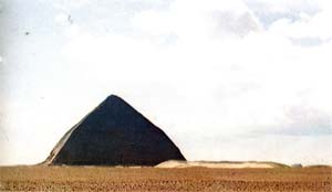 Mais finalement, on jugea préférable de renoncer à l’utilisation de ce monument pour y ensevelir le roi, et après avoir, peut-être, momentanément envisagé de réemployer pour lui la pyramide de Meïdoum en la transformant en pyramide véritable, on entreprit d’en construire une autre à Dahchour à 1 800 mètres au nord de la première. Adoptant pour cette pyramide septentrionale la pente réduite du tronçon supérieur de la rhomboïdale, on porta la longueur de son côté à 420 coudées, de façon à obtenir sensiblement la même hauteur que dans cette dernière. Un soin particulier fut apporté à la construction des voûtes couvrant les trois hautes salles intérieures, qui ne comportèrent d’encorbellements que sur deux faces et non sur les quatre comme à la rhomboïdale.