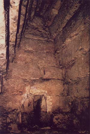 Par suite d’affaissements constatés dans sa descenderie, on aurait ceinturé le monument par une tranche périphérique d’une quinzaine de mètres d’épaisseur, dont l’inclinaison en parement fut ramenée à 54° 30’. Puis, les parois de la chambre supérieure ayant commencé à bomber, de puissants étais y furent disposés, qui ne purent empêcher l’apparition de fissures dans la voûte en encorbellement.