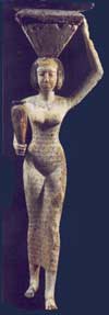 Dès l’Ancien Empire, les Egyptiens représentent sur les parois des chapelles des processions de jeunes femmes transportant les denrées destinées au défunt. Ces porteuses d’offrandes personnifient dons les productions des domaines agricoles que le mort possède de son vivant et qui lui assurent symboliquement la nourriture nécessaire pour l’éternité. Disposées en file indienne, coiffées d’une perruque longue et vêtue d’une robe fourreau, elles portent un panier sur la tête et de leur autre main tiennent une volaille, une fleur, un vase ou un animal en laisse.