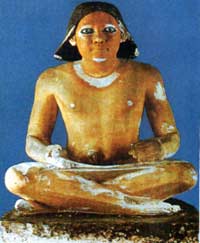 Haute de 53 cm, la statue du "scribe accroupis" figure un homme dans la force de l’age assis en tailleur et regardant droit devant lui. Cet oeuvre de calcaire peint, sculptée au environ du XXVem siècle avant J.C., ne cesse d’étonner et de provoquer l’admiration par sa présence et son réalisme. On ne connaît pas l’identité du personnage, mais la qualité exceptionnelle de la statue, le soin particulier apporté au traitement du cops, des yeux et du visage font pencher pour un homme certainement important, peut être Kai, gouverneur de province. Celui-ci, dans la position caractéristique de l’homme qui écrit, assis par terre les jambes croisées, le rouleau de papyrus déroulé sur les genoux, est vêtu d’un simple pagne, tenue ordinaire des Egyptiens, serré à la taille par une ceinture et tombant aux genoux. L’intelligence de sa physionomie et la vivacité de son regard sont soulignées par les yeux rapportés, incrustations de quartz blanc, d’ébène et de cristal de riche serties dans le cuivre. Des yeux aussi "vrai" que ceux de Rahotep et son épouse Nofret, membres de la famille royale de la IIem dynastie, qui parurent tellement vivant au yeux des ouvriers qui ouvrirent leur tombeau que ces derniers, frappé d’effroi, quittèrent le chantier sur le champ.
