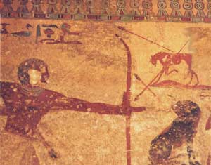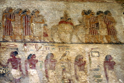 La scène la plus célèbre reste celle du défilé des Asiatiques, qui se déroule sur le mur nord. Les étrangers sont coiffés et vêtus à la mode de leur pays. Les hommes ont des cheveux bruns courts, assez volumineux, et une barbe pointue remontant sur les joues. Ils sont vêtus de pagnes ou de robes drapées sur une épaule confectionnés dans es tissus chamarrés à motifs géométriques blanc et rouges. Leurs pieds sont chaussés de sandales lacées. Les femmes ont des cheveux long retenus sur le front par un bandeau de tissus clair. Leurs robes, dégageant parfois une épaule, descendent jusqu’à mi-mollet. Elles sont taillées dans des tissus du même type que ceux des parures masculines. Elles portent des chaussures remontant jusque sur les chevilles. Les enfants marchent devant elles, les plus petits ballottés dans un panier sur le dos d’un âne. Deux personnages poussent devant eux des gazelles captives destinées au nomarque. Les hommes tiennent leurs armes de chasse et des instruments de musique. La troupe pacifique avance doucement vers le défunt représenté en grande taille, debout, sa canne à la main. Un héraut égyptien lui tend un papyrus annonçant et datent l’événement.